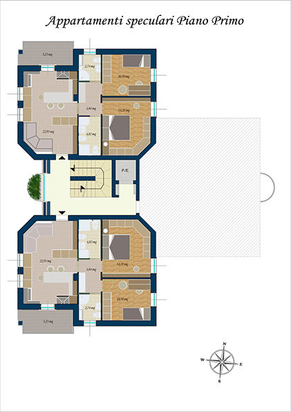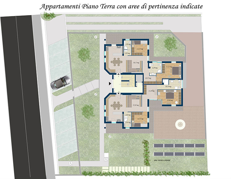 2 APPARTAMENTI AL PIANO TERRA - cucina/soggiorno, bagno zona giorno, disimpegno, bagno zona notte, due camere;